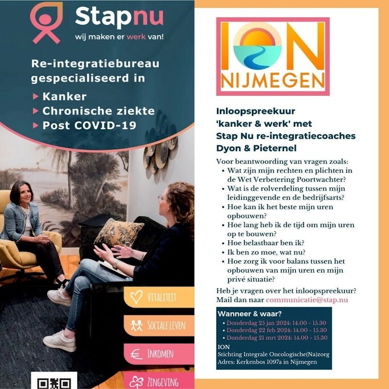 Op ION Nijmegen worden inloopspreekuren 'Kanker & Werk' gehouden vanuit Stap-nu.