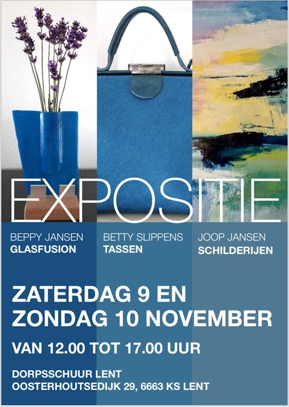 Op 9 en 10 november wordt er een drie dubbele expositie gehouden in de Dorpsschuur in Lent. Deze expositie wordt verzorgd door, Betty Slippens, Joop Jansen en Beppy Jansen-Lusing.