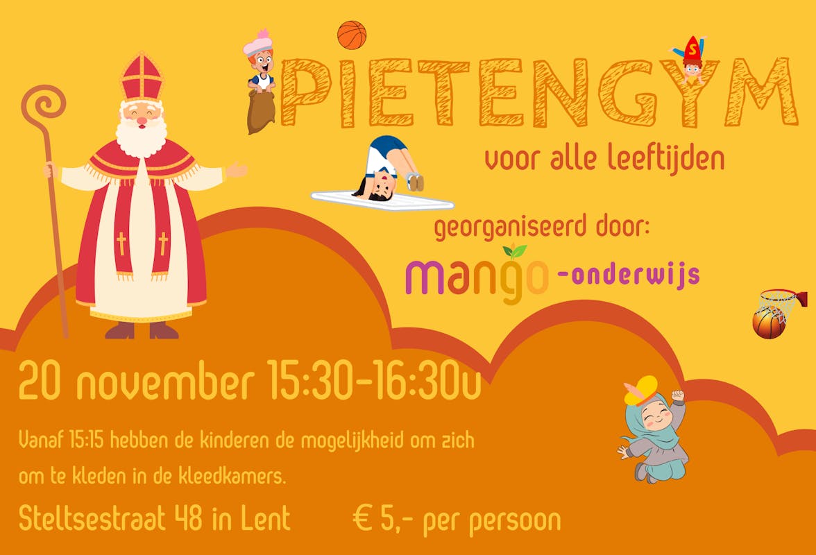 Zet het in je agenda! Op 20 november van 15:30 tot 16:30 uur organiseren we een Pietengym!