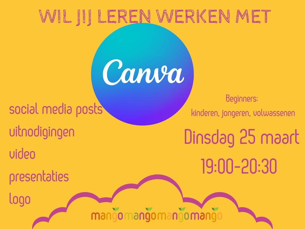In deze inspirerende workshop ontdek je de basisprincipes van Canva en leer je hoe je prachtige ontwerpen maakt, van social media posts, uitnodigingen tot video's en presentaties. Geen ervaring nodig!