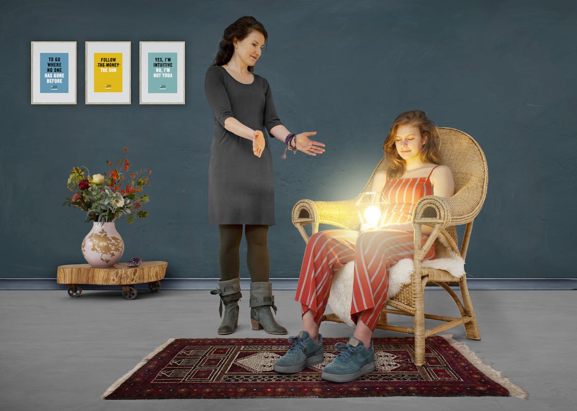 Studenten van de healingopleiding geven healingen, onder supervisie van een leraar.
