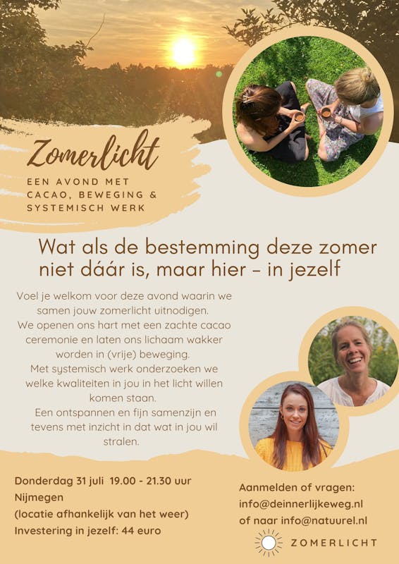 Voel je welkom voor deze avond waarin we samen jouw zomerlicht uitnodigen. We openen ons hart met een zachte cacao ceremonie en laten ons lichaam wakker worden in (vrije) beweging. Met systemisch werk onderzoeken we welke kwaliteiten in jou in het licht willen komen staan. Een ontspannen en fijn samenzijn en tevens met inzicht in dat wat in jou wil stralen.