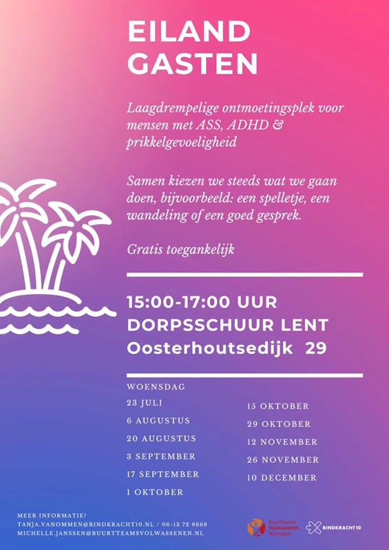 De organisatie is in handen van Bindkracht 10 en Buurtteams Volwassenen Nijmegen. Voor meer informatie kun je contact opnemen met Tanja van Ommen: of Michelle Janssen: