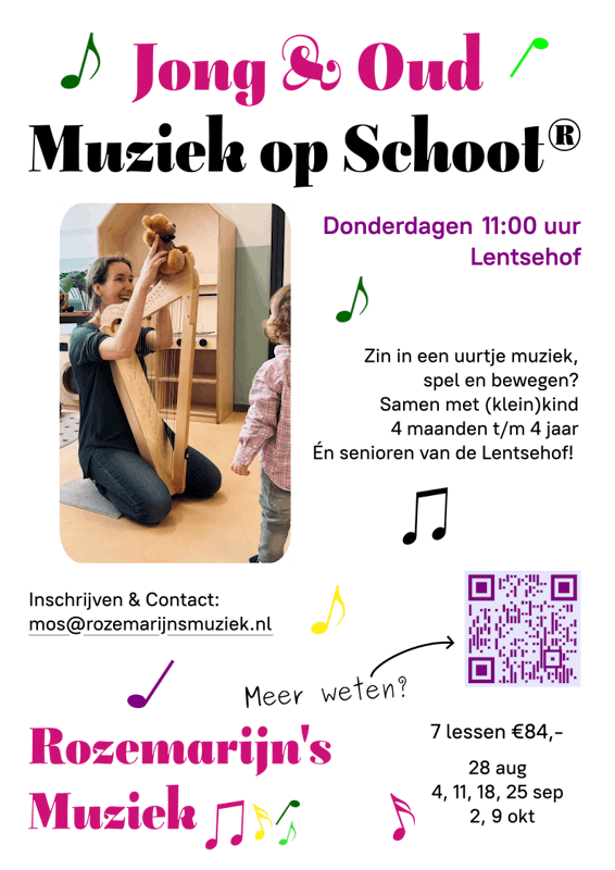Deze groepen worden gegeven in de huiskamer van De Lentsehof waarbij de seniore bewoners betrokken worden bij het muzikaal spel. De muziek verbindt drie generaties in plezier, samenzijn en bijzondere interactie tussen jong en oud. Een prachtige beleving!