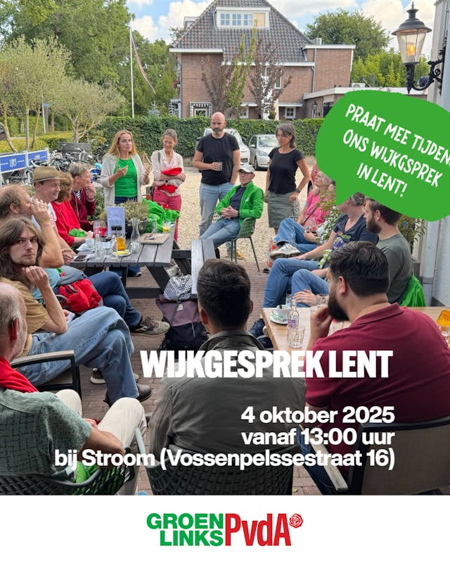 Op zaterdag 4 oktober komen GroenLinks en PvdA naar Lent. We gaan langs de deuren (tussen 11:00 en 13:00 uur) én nodigen iedereen van harte uit voor het wijkgesprek in Stroom vanaf 13:00 uur.