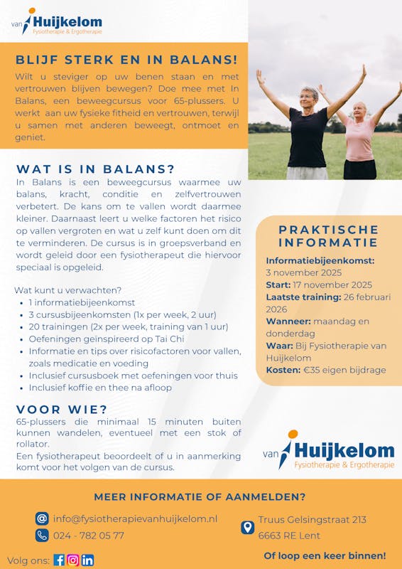 Wilt u zich zekerder voelen bij het lopen en bewegen? Doe dan mee met de valpreventiecursus bij Fysiotherapie van Huijkelom. Vanaf 17 november start de cursus In Balans. Deze 13 weken durende cursus helpt om de kans op vallen te verkleinen. Daarnaast verbetert uw kracht, conditie, balans en zelfvertrouwen. Ook leert u welke factoren het risico op vallen vergroten en wat u zelf kunt doen om dit te verminderen. De cursus vindt plaats in groepsverband en wordt bijna volledig vergoed vanuit subsidies van de Gemeente. De eigen bijdrage voor de gehele cursus is slechts €35.