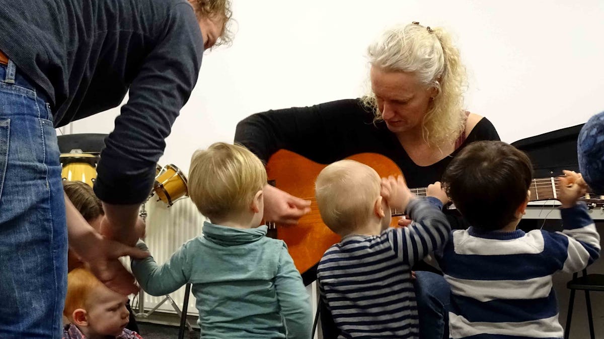 Martine neemt haar gitaar mee. Samen met de peuters maakt zij er een muzikaal feestje van. Het plezier tussen (groot)ouder/verzorger en kind staat voorop.