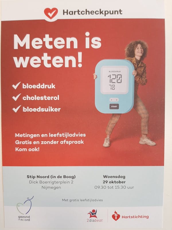 Wil je weten hoe het staat met je hartgezondheid? Kom dan op ๐๐ผ๐ฒ๐ป๐๐ฑ๐ฎ๐ด ๐ฎ๐ต ๐ผ๐ธ๐๐ผ๐ฏ๐ฒ๐ฟ naar het Hartcheckpunt in STIP Noord (in de Boog), Dick Boerrigterplein 2 in Nijmegen. Tussen 09.30 en 15.30 uur kun je hier ๐ด๐ฟ๐ฎ๐๐ถ๐ ๐ท๐ฒ ๐ฏ๐น๐ผ๐ฒ๐ฑ๐ฑ๐ฟ๐๐ธ, ๐ฐ๐ต๐ผ๐น๐ฒ๐๐๐ฒ๐ฟ๐ผ๐น ๐ฒ๐ป ๐ฏ๐น๐ผ๐ฒ๐ฑ๐๐๐ถ๐ธ๐ฒ๐ฟ laten meten en in gesprek gaan over jouw leefstijl.