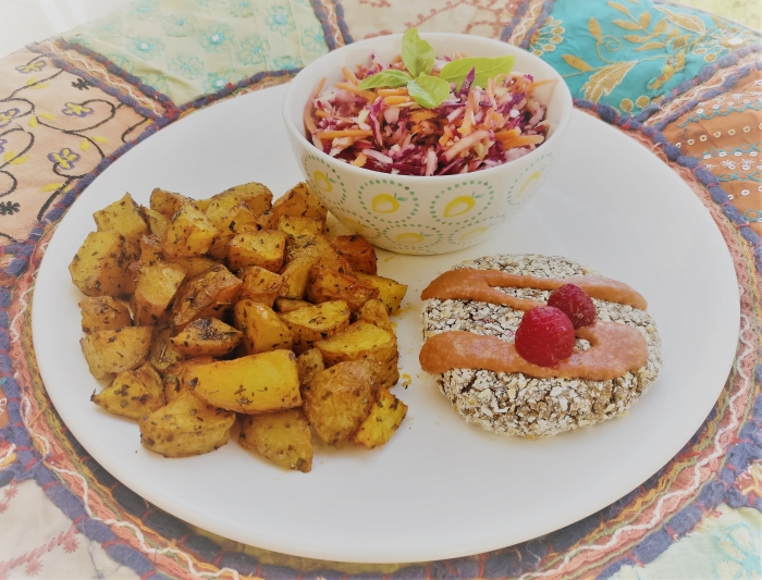 Menu van deze week: Mediterrane vega burgers met ovenaardappeltjes en coleslaw (rauwkost) met een optioneel bijzonder frambozen-cashew sausje óf gewoon mayo of ketchup.