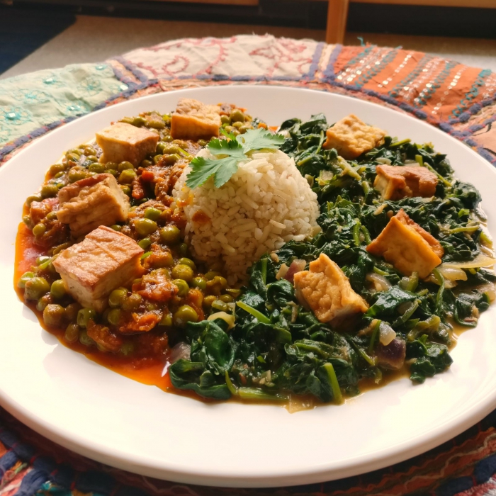 Matar Paneer (tomaat-tuinerwtjes-aardappel) en Palak Paneer (spinazie). Erbij serveer ik vegan "paneer" van tofu én gezonde zilvervliesrijst. Als je liever geen tofu eet, kan je dat op het bestelformulier bij 'opmerkingen' een alternatief (cashewnoten) aanvragen.