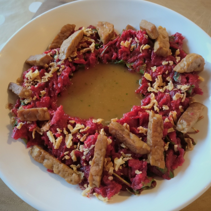 Een verrassende stamppot met o.a. rode biet, geraspte appel, bladgroen, gebakken uitjes. Erbij overheerlijke 24u-gemarineerde tempeh-reepjes én vega jus.