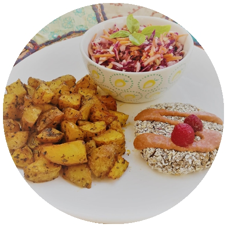 Als bijgerecht kruidige ovenaardappeltjes en ‘coleslaw’ (rauwkost) met een romige vegan dressing.