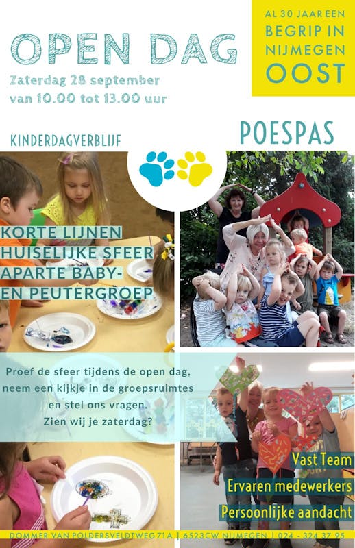 Elk jaar organiseert Poespas, gevestigd aan de Dommervanpoldersveldtweg 71a in Nijmegen, een kleinschalige open dag. Net over de waalbrug en ideaal voor als je in Nijmegen werkt. De Sint Maartenskliniek, Radboud, Universiteit of HAN zijn vijf autominuten rijden.