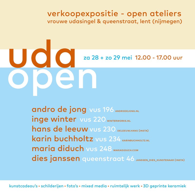 Za 28 en zo 29 mei van 12-17 uur openen Andro de Jong, Inge Winter, Hans de Leeuw, Karin Buchholtz, Maria Diduch en Dies Janssen (Queenstraat) hun ateliers aan de Vrouwe Udasingel voor publiek, welkom!