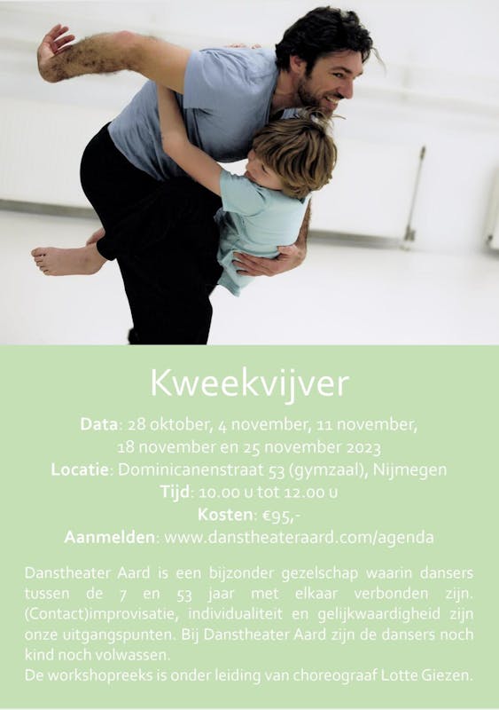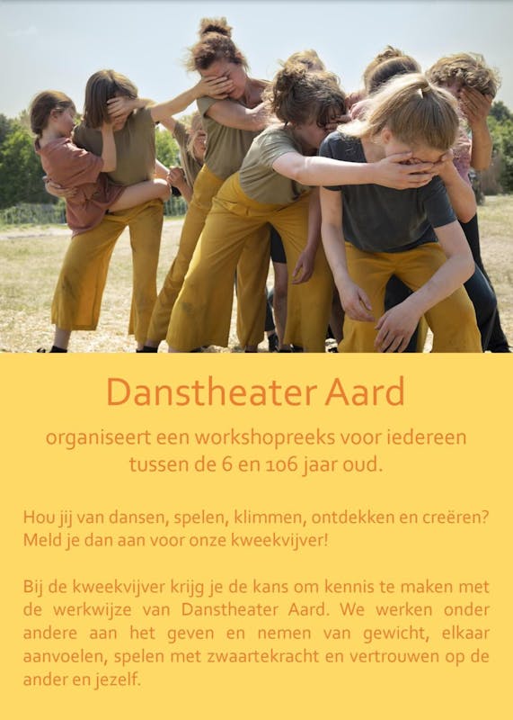 Bij de kweekvijver krijg je de kans om kennis te maken met de werkwijze van Danstheater Aard. We werken onder andere aan het geven en nemen van gewicht, elkaar aanvoelen, spelen met zwaartekracht en vertrouwen op de ander en jezelf.