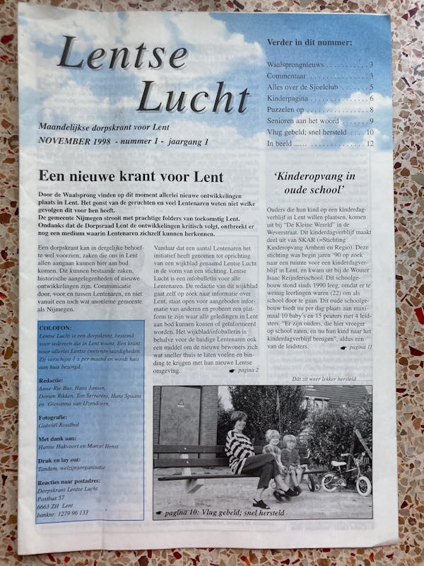Dit jaar bestaat de Lentse Lucht 25 jaar. Aan de wieg van het blad staat huisarts Ton Serrarens. In de jaren negentig zag hij dat de Waalsprong, zoals dat toen heette, in Lent veel onrust bracht. Om verbinding te brengen tussen de bewoners van het oude en het nieuwe Lent, kwam Ton met het idee van een wijkblad. Hij verzamelde een aantal Lentenaren om zich heen die de redactie vormden. Een half jaar na de oprichtingsvergadering op 29 april 1998 kwam het eerste nummer uit.