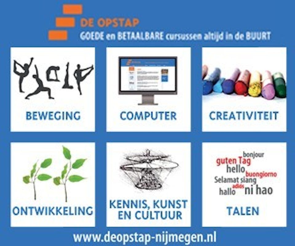 Bijna alle cursussen voor het volgende seizoen 2022-2023 staan weer op onze website www.deopstap-nijmegen.nl . Wij hebben naast de bekende cursussen zoals schilderen, naaien, ...