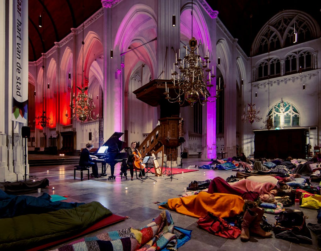 Een piano/cello concert in de Stevenskerk waar je liggend naar mag luisteren. En waar je voorafgaand aan het concert een mindfulness sessie krijgt onder begeleiding van live gespeelde harpmuziek.