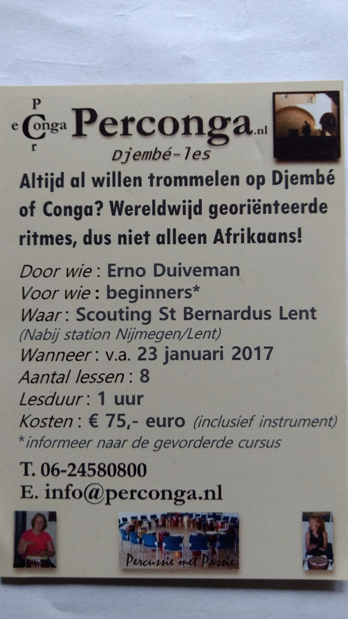 Op maandag 26 september a.s. begint Erno van Perconga / Trommelfeestje een introductiecursus Djembé. Altijd al eens willen leren djembé spelen? Je leert in een groep gezamelij...