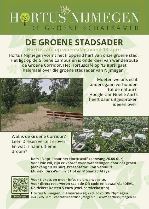 U kunt van te voren een ticket (5 euro) reserveren via https://shop.ikbenaanwezig.nl/tickets/event/hortus-caf-de-groene-stadsader