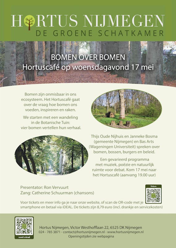 Het Hortuscafé 'Bomen over Bomen' op woensdagavond 17 mei (aanvang 19.00 uur, inloop vanaf 18.45 uur) is een mix van verhalen, poëzie, interviews, beleven en muziek.