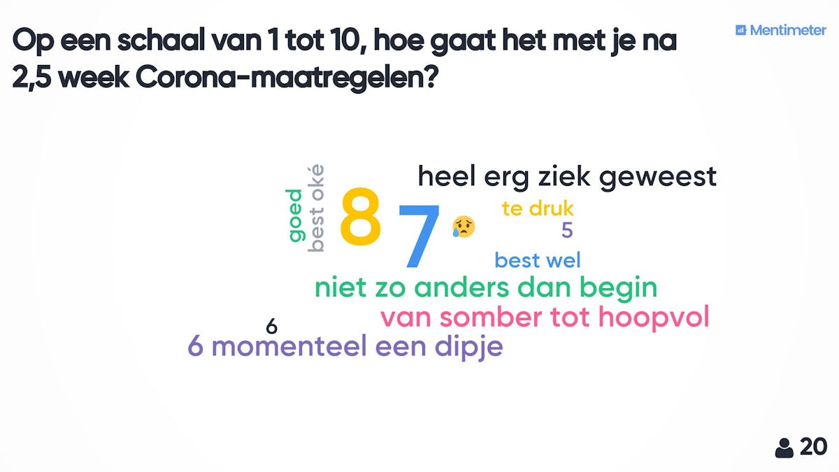 De antwoorden lopen uiteen, hoe groter de tekst hoe vaker dat antwoord genoemd is.Voorzichtig wil ik concluderen dat het gemiddelde ongeveer een 6,5 is. Dat is gezien de omstandigheden een voldoende.