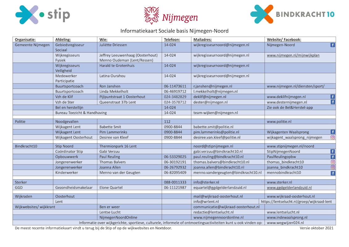 Een papieren versie is te krijgen bij de Stip Noord. Wil je het overzicht digitaal, stuur me een berichtje of download het op de wijkwebsites www.lentselucht.nl of www.nijmegennoordonline.nl 2021-10-18 DEF Infokaart sociale basis Noord.pdf