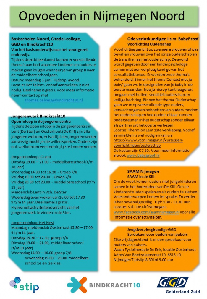Voor Nijmegen-Noord is er een opvoedkalender gemaakt. In die kalender staan opvoedactiviteiten die preventief en voorliggend worden aangeboden in Nijmegen-Noord. De huidige kalender loopt tot en met augustus. In september zal er een nieuwe kalender komen voor september t/m december. De kalender kan je ook vinden bij de Stip en op de wijkwebsites en nextdoor.