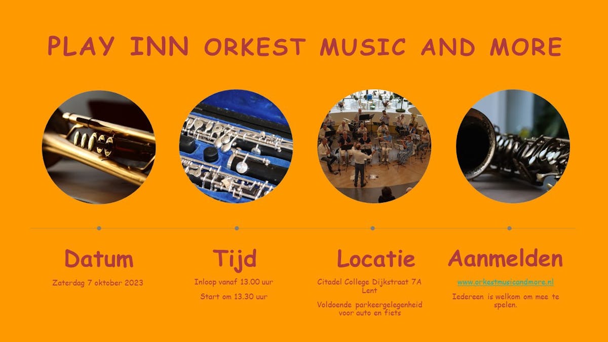 Orkest Music and More organiseert op zaterdag 7 oktober een Play Inn. Als je zin hebt om mee te spelen dan ben je van harte welkom. Meld je van tevoren even aan via onze Facebookpagina (www.facebook.com/orkestmusicandmore/ en vermeld ook even het instrument dat je speelt), Dan hebben we de muziek uitgeprint voor je klaar liggen.