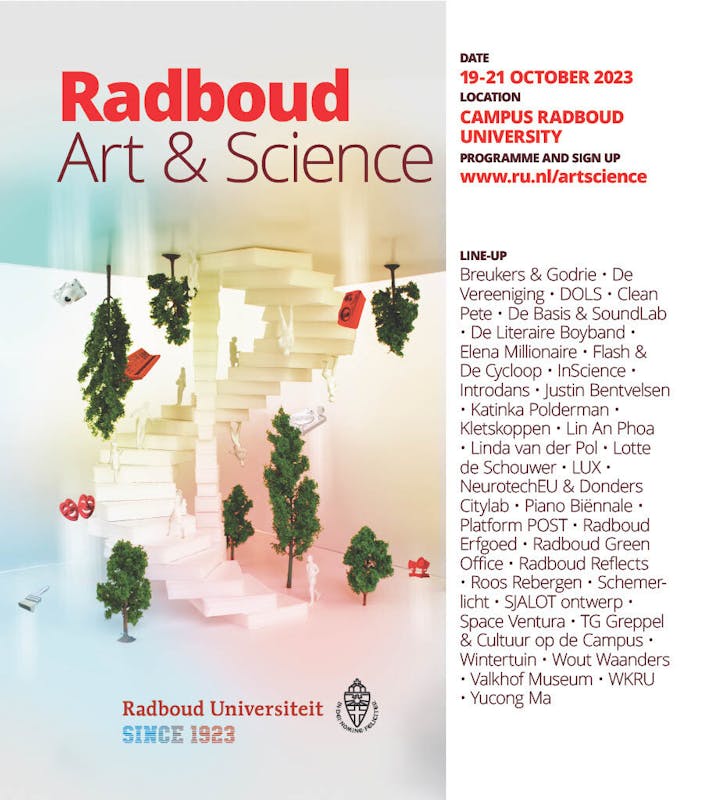 Op 17 oktober bestaat de Radboud Universiteit 100 jaar. Naast officiële feesten, wordt de verjaardag van 19 tot en met 21 oktober 2023 op de campus van de universiteit gevierd met een gratis toegankelijk festival voor iedereen. Op Radboud Art & Science komen kunst en wetenschap samen.