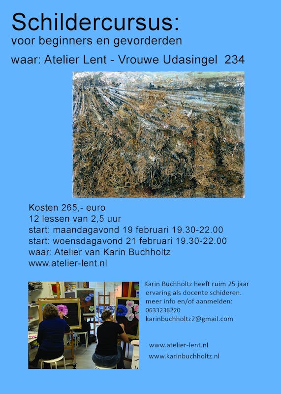 Altijd al willen schilderen? Waar wacht je nog op? Geef je vandaag nog op voor de beste Schilderscursus (ook voor gevorderden) in de omgeving: Atelier Lent- Atelier van Karin Buchholtz. start 19 en 21 februari 1930-22.00. zie www.karinbuchholtz.com