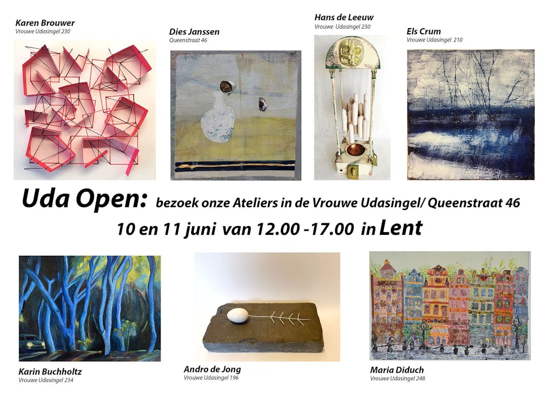 Dit jaar staan de atelierdeuren van Hans de Leeuw, Andro de Jong, Dies Janssen 9Queenstraat), Maria Diduch, Els Crum, Karin Buchholtz en Karen Brouwer wijd open in het kader van UDA OPEN, welkom!