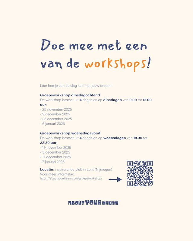 Ontdek je DROOM vanuit je WARE ZELF! Dit jaar starten er twee workshops waar je aan mee kan doen (maximaal 10 personen)!