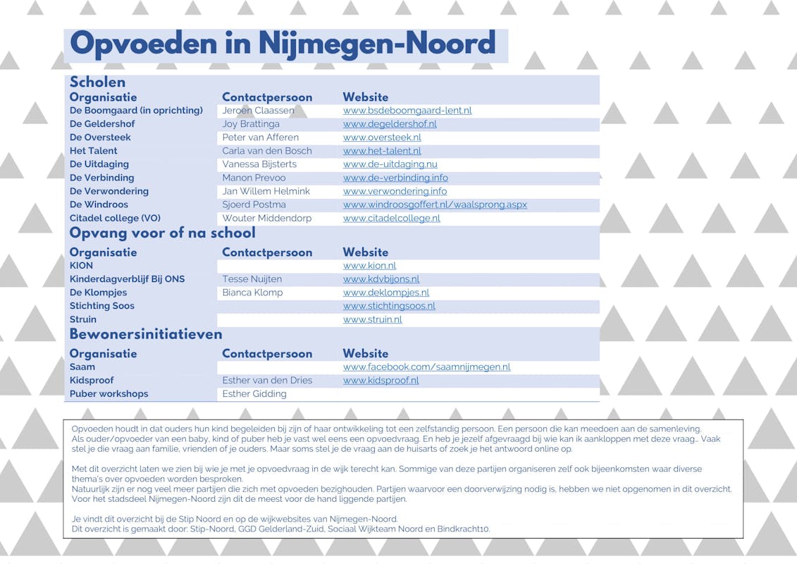 Opvoeden houdt in dat ouders hun kind begeleiden bij zijn of haar ontwikkeling tot een zelfstandig persoon. Een persoon die kan meedoen aan de samenleving. Als ouder/opvoeder van een baby, kind of puber heb je vast wel eens een opvoedvraag. En heb je jezelf afgevraagd bij wie kan ik aankloppen met deze vraag… Vaak stel je die vraag aan familie, vrienden of je ouders. Maar soms stel je de vraag aan de huisarts of zoek je het antwoord online op. Met dit overzicht laten we zien bij wie je met je opvoedvraag in de wijk terecht kan. Sommige van deze partijen organiseren zelf ook bijeenkomsten waar diverse thema’s over opvoeden worden besproken. Natuurlijk zijn er nog veel meer partijen die zich met opvoeden bezighouden. Partijen waarvoor een doorverwijzing nodig is, hebben we niet opgenomen in dit overzicht. Voor het stadsdeel Nijmegen-Noord zijn dit de meest voor de hand liggende partijen. Je vindt dit overzicht bij de Stip Noord en op de wijkwebsites van Nijmegen-Noord. Dit overzicht is gemaakt door: Stip-Noord, GGD Gelderland-Zuid, Sociaal Wijkteam Noord en Bindkracht10. |