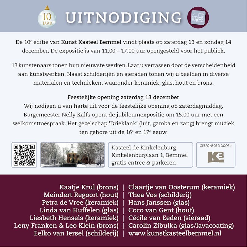 In het tweede weekend van december opent Kasteel de Kinkelenburg haar deuren voor de 10e editie van Kunst Kasteel Bemmel. Op zaterdag 13 en zondag 14 december, van 11.00 tot 17.00 uur, wordt het romantische kasteel omgetoverd tot een warm winterdecor waarin hedendaagse kunst schittert te midden van de historische stijlkamers.