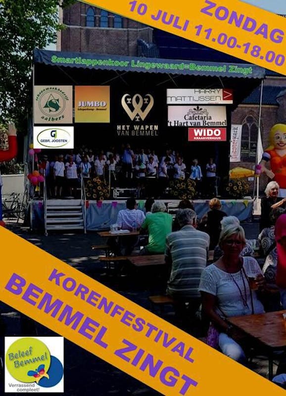 Dankzij en samen met de OVB (Ondernemersvereniging ‘’Beleef Bemmel”), sponsors, de deelnemende koren en de vele vrijwilligers gaat Smartlappenkoor Lingewaard er a.s. zondag 10 juli vanaf 11.00 uur tot 18.00 uur een gezellige Bemmelse muzikale meezing-dag van maken.